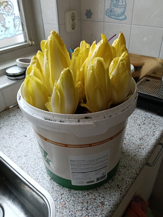 Ik ben er nu niet zo fanatiek mee omdat ik genoeg ervan weet denk ik, maar ik heb wel eens een winterlang groente binnengekweekt. Geen moesten die heb ik af moeten staan, maar binnen kan je ook wel wat en niet alleen teamgroenten. En ja of drie geleden had ik paksoi gezaaid binnen, en daar heb ik gewoon drie keer van gegeten met zijn vijven. En nu heb ik dit, dit heb ik ook vaker gedaan maar nu heb ik mijn wortels moeten kopen waar ik het toen zelf opkweekte in de moestuin. Dit is dus binnen gekweekt, voor uitstel voor de oogst zet ik het even op het balkon. Op het balkon staan nog 2 emmers3 punten