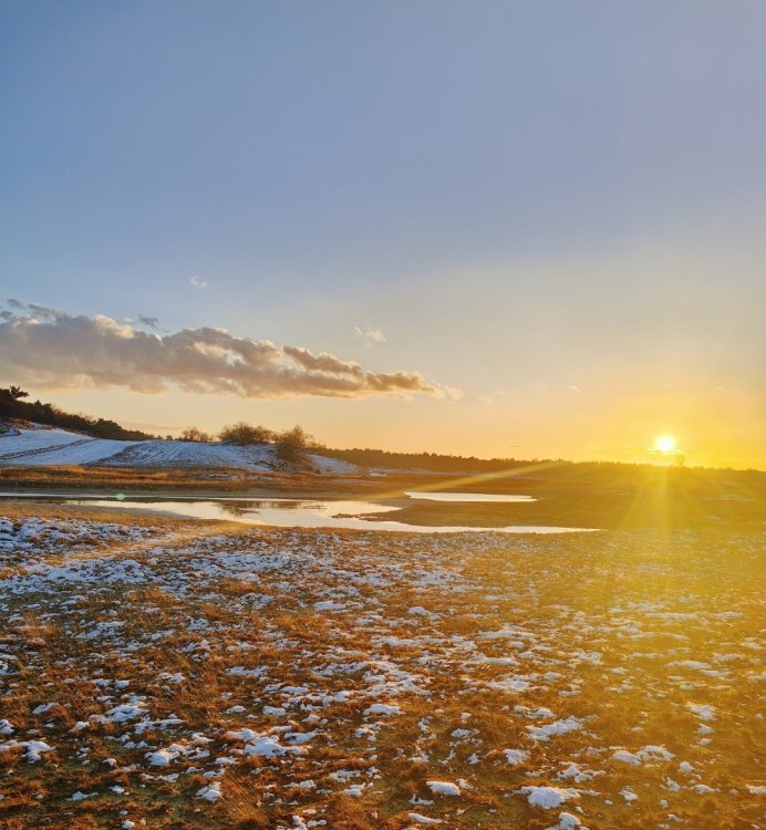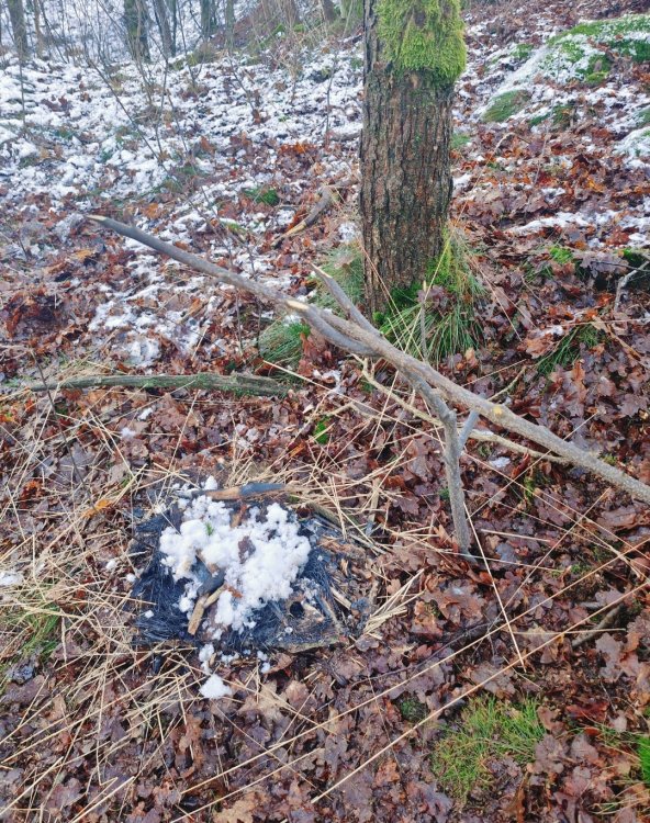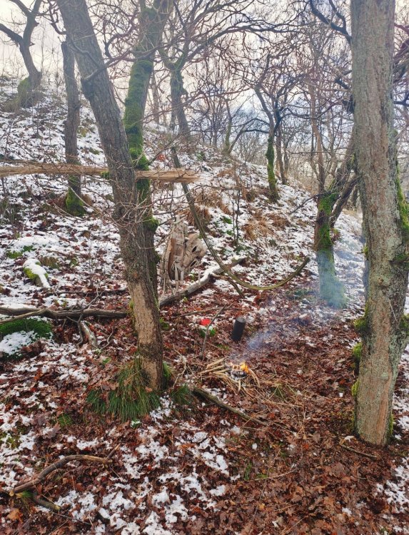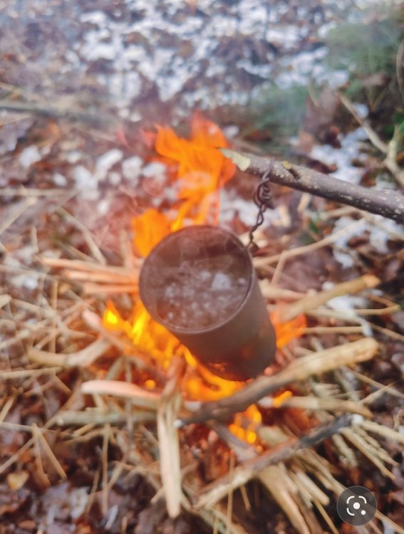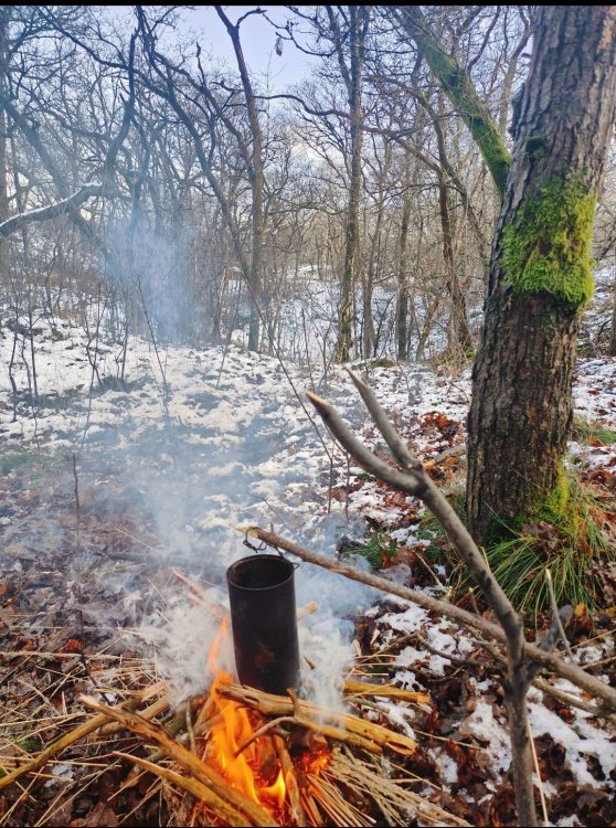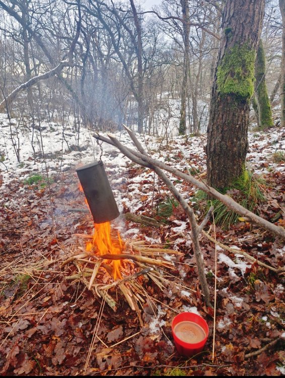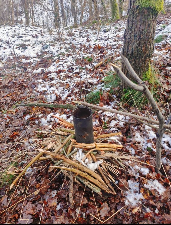 Gewoon een voorbeeld. Het is nu toch rustig op het forum. Ik daag mezelf graag uit om met 1 haal over de firesteel vuur te kunnen maken. Nu het al weer weken lang dagelijks regent of sneeuwt vindt ik het zelf extra interessant om een bakske koffie te zetten. Ik ben altijd best trots als het lukt, dus toch maar delen hier voor de gezelligheid. Ik heb van huis meegenomen: firesteel , zigzag watten in vaseline , en een stukje fatwood. Een oud blikje met een haakje eraan van koper draad. ik ben naar de Loonse en Drunense duinen gegaan. In eerste instantie wilde ik met berken aan de gang gaan. Maar ter plaatse gekozen om een flinke hand, pijpen strootjes gras te oogsten. Zo heb ik het opgebouwd; Ik heb de grond niet vrijgemaakt omdat toch alles zeik nat is . Ik heb een stuk bast gevonden en dat als bodem neer gelegd. Daarop heb ik een deel van het strootjes gras als een cirkel in elkaar geknoopt/ gedraaid. Ala vogelnestje. Daar weer boven op met het mes wat schilvers van de fatwood gelegd en het stukje fatwood erbij gedaan. Vervolgens wat hangende dode takken uit de bomen rondom mij heen verzameld. Het water eraf geslagen, in stukjes gebroken en er rondom heen en overheen gelegd. Idee van kan het eerst drogen en daarna branden. Dus geen gedoe met splijten enzo. Vervolgens heb ik wat van de watten ter hoogte van de bovenkant van het strootjes gras geplaatst als vonk vanger. ( Heel dun uit elkaar geplukt als spinnenweb) En een verse tak gebruikt als kook opstelling. Je moet maar inzoomen om het eventueel goed te bekijken. En jawel een keer schrapen over de firesteel en vuur🥳 Het rookte wel stevig vanwege het vocht. Een tijdje later kookte het water. Nouja dat duurde best lang. Zo zat ik erbij met het lekkerste bakske koffie ter wereld: Een beetje moeilijk te zien allemaal Maar als je goed kijkt zie je links in de boom de ander helft van het strootjes gras nog hangen , in de boom erachter mijn rugzak en van links naar rechts hangt een survival hangmat...zon ding van een euro of zes zeven. Ideaal in vochtige omstandigheden om droog te zitten. Het regende niet anders hing er een tarpke. Het belangrijkste zit in dat rode bekertje 😄 Ik deel dit omdat met de juiste voorbereiding je dus helemaal niet moeilijk hoeft te doen. Met wat watten van thuis en een stukje meegebracht fatwood is het vrij eenvoudig allemaal. Dat is toch een beetje prepper waardig. Anders had je echt dat gras helemaal moeten kneuzen, het hout moeten splijten en eventueel feathersticks moeten snijden. En dan zo het vuur moeten opbouwen ipv in een keer de brandstapel aan te kunnen steken. Afijn een paar bakskes later en nog een keer opnieuw het vuur aan moeten steken (met het tweede deel van het gras). De boel zo weer achter gelaten. Het leave no trace principe gebruik ik nog zelden. Je moet sowieso een goed oog hebben om het van een paar meter afstand te kunnen zien. Meestal laat ik het zo staan , ter inspiratie voor anderen of als tijdelijk markering punt voor mezelf ( het verdwijnt vrij snel ). Ik vind het zelf ook altijd boeiend om plekken van anderen te zien/ vinden. Groetjes uit Brabant. P.s. als je goed kijkt zie je hier overal Pijpenstrootje gras staan.3 punten