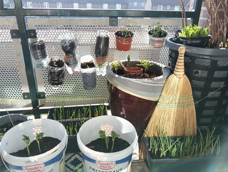 Ik heb 7 jaar moestuin gehad twee goede jaren de rest was een drama, dat had te maken met de contacten onderling van mijn nieuwe Buurman. Doe maar nieuwe Buurman eindelijk bij trok kregen een nieuw bestuur met een voorzitter. En dat was duidelijk reden voor vertrek ik had er geen zin meer in. Zelf groente verbouwen zit gewoon in mijn verlangen Ik wil het zien groeien Ik wil het zien bloeien en ik wil genieten van wat er natuur te bieden heb, omdat het al niet goed ging zat ik mijn al jarenlang te vergapen aan groente die investig gekweekt werden of in emmers potten en pakken. Nee want is niet het enige van wat onderuit gaat, maar ik zie niet zoveel slapend volk als hier, Ik heb meegekregen dat 80% van de Nederlanders veel vertrouwen heeft in de mainstream media, persoonlijk merk ik dat ook erg om me heen dus gebeurt er verder hier helemaal niks je moet het echt zoeken op YouTube en in het buitenland, en tiktok is altijd beter. En ik ben begonnen In de flessen aan de reling staat snijbiet, in de hele rechte bak staat fruitstruiken Daarna staat een bakkie met gekochte Egyptische spinazie zeggen ze, het was lekker en ik hoop dat ze wortels krijgen zodat ze nog een keer kunnen groeien hè beneden zie je twee bakken met kleine uien die ga ik groen eten maar ze gaan wel alle groeien dan alleen de blaadjes, krijgen ook echt en wit knolletje. Voor die tijd moet ik ze wel dunne en dan heb je gewoon een lente uit, eerlijk gezegd heb ik hier drie bakken van. En in de emmers staan per er maar drie planten tuinbonen. Ik heb al geconcentreerd op groenteplanten die gewoon winterhard zijn en volgend jaar terugkomen, en in de tweede pot van rechts staat dus ook eeuwig Moes tweestruiken, nieuw aangeschaft maar die had ik in de tuin ook en die kunnen 40 jaar oud worden bij een goede verzorging. En wat nog moet komen is te ranke spinazie dat is een klimplant die je eet als spinazie. Dat staat alleen op dit stukje. Mijn balkon is 3 bij 2 meter. Ligt goed op de zon. Omdat ik ook een regenton heb van 50 liter beslaat dit stuk anderhalve meter.3 punten