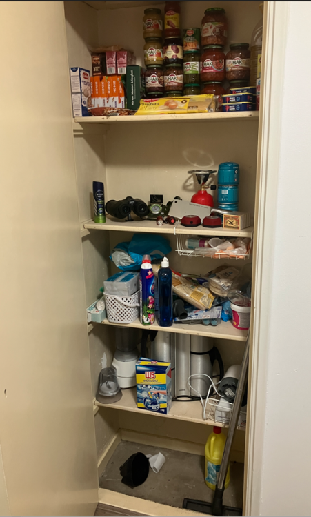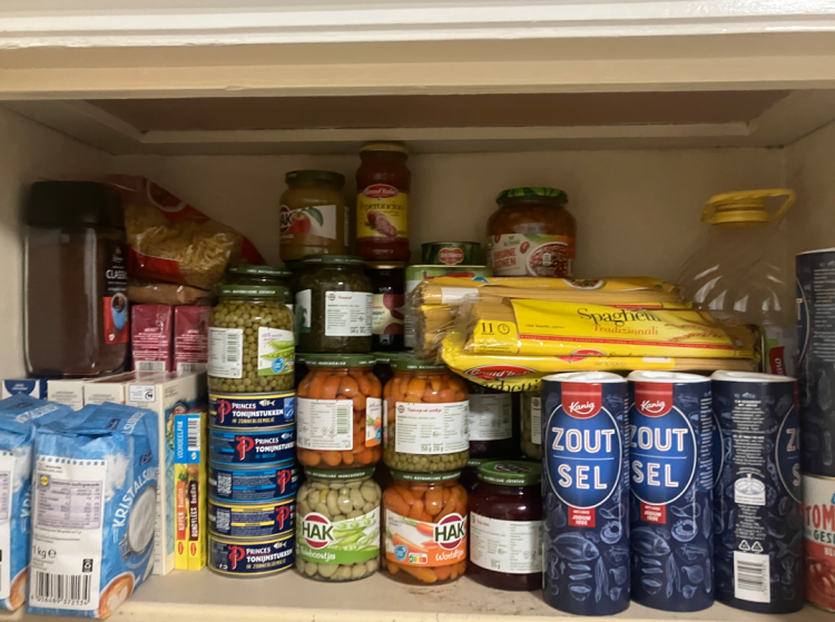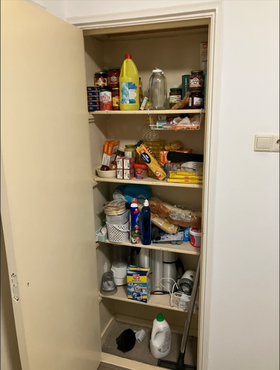 13. Valt nog veel eten te verzamelen, maar kruiden en ander spul zet ik hier niet in. Netjes indelen komt later wel, het doel is dat het straks mooi compact gaat worden omdat ik er nog niet ben met alles. Voor nu alleen nog het broodnodige en dan wekelijks/maandelijks aanvullen afhankelijk van budget (armoede grens, maar ik klaag zelf niet!). Vlees is even uitzoeken, want wil dit zelf gaan wecken omdat de blikken mij tegenvallen. Wanneer ik denk dat het eten compleet is, leg ik alles uit op tafel en maak een foto met overzicht, mocht er dan iets ontbreken wat echt essentieel is dan hoop ik dat iemand mij daarop attendeert. Voor nu eerst zelf verder zoeken en afweging maken van kwaliteit vs. prijs. Ik moet nog noten, chocolade en etc. hebben en kan nog wel 100 dingen bedenken. PS: Speciaal droog opbergen doe ik niet in deze kast, ik gebruik dit (behalve het zout dan šŸ™ƒ)