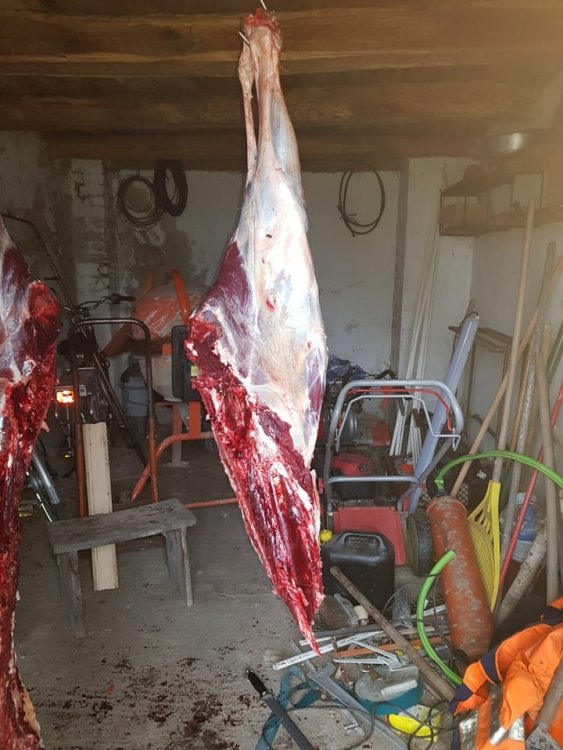 Omdat wij vrijwel zonder geld leven is ruilen voor ons een heel belangrijk deel van ons leven en onderhoud. Nu hebben vrienden van ons het wat ruimer dan wij en ze bestelden een hert bij hun buurman, een jager. Vandaag werd het hert geleverd, zonder kop en onderpoten al snel een kilo of 200. Ze konden het allemaal niet kwijt in de vriezer dus werd ons gevraagd of we een deel wilden hebben... wetende dat we geen geld hebben voegden ze eraan toe dat ze het wel wilden ruilen voor een oeroud petroleumfornuisje wat ze ooit hier hebben zien staan. Dat ding staat al jaren in de weg dus ik hapte meteen, JAAAA deal! Dit is het stukje vlees dus wat we krijgen morgen... vers hert, wat wil je nog meer?