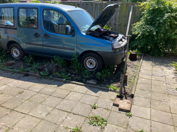 Oud, veel ellende en mag er van mijzelf alles mee doen wat ik maar wil. Ik had er al veel aan gedaan (veel kortsluiting door marter), maar moet nog veel meer doen. Vandaag drie scooters weg, motorbrug, velgen en heel veel ander metaal spul. Morgen hopelijk leeg zodat de auto daar kan staan.